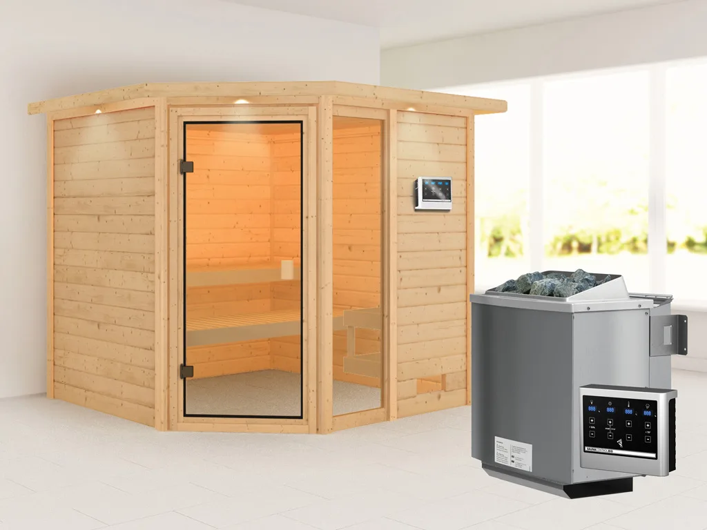 Eckeinstieg: Diese Sauna mit Eckeinstieg eignet sich besonders gut für kleine Räume. Platzsparend und kompakt passt sie in jeden Raum und nutzt die Fläche optimal.