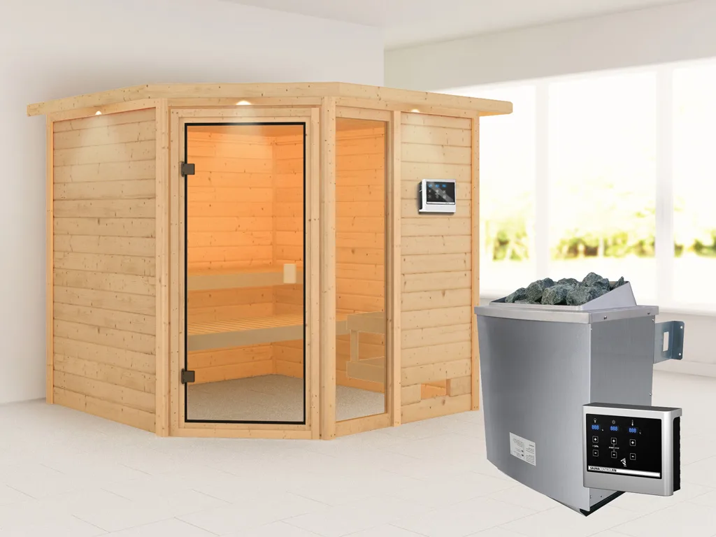 Diese Innensauna wird einschließlich Saunaofen mit externer Steuerung geliefert. Die Anbringung an der Außenseite der Sauna ermöglicht eine praktische Bedienung vor dem Saunieren und eine noch exaktere Einstellung der Temperatur. Weitere elektrische Geräte, wie eine Kabinenbeleuchtung, können ebenso an die externe Steuerung angeschlossen und mit dieser bedient werden.