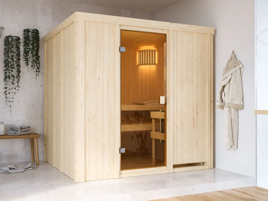 • Diese Elementsauna bietet dank ihrer Wandstärke von 68 mm und der im Wandelement eingebauten Mineralwolldämmung eine hervorragende Energieeffizienz. Die vorgefertigten Wandelemente, die außen mit Softline-Profilholz verkleidet sind, sind leichter als Holz und haben gleichzeitig einen höheren Dämmwert. Darüber hinaus sind Saunen mit diesem Wandaufbau günstiger als die Produkte aus Vollholz. Die Sauna verfügt über ein Außenmaß von 196 cm x 178 cm und ein Innenmaß von 181 cm x 164 cm. Das Volumen der Sauna beträgt 5,7 cbm. Durch die formschöne Saunatür gelangen Sie ins Innere der Kabine mit Ihren 2 Liegen. Die Liegen sind ausreichend breit bemessen und bieten Ihnen die nötige Entspannung. Die Lieferung erfolgt inkl. Ofenschutzgitter. Unsere Elementsaunen haben 2 Sichtseiten und 2 Seiten, welche mit einer Hartfaserplatte ausgestattet sind.