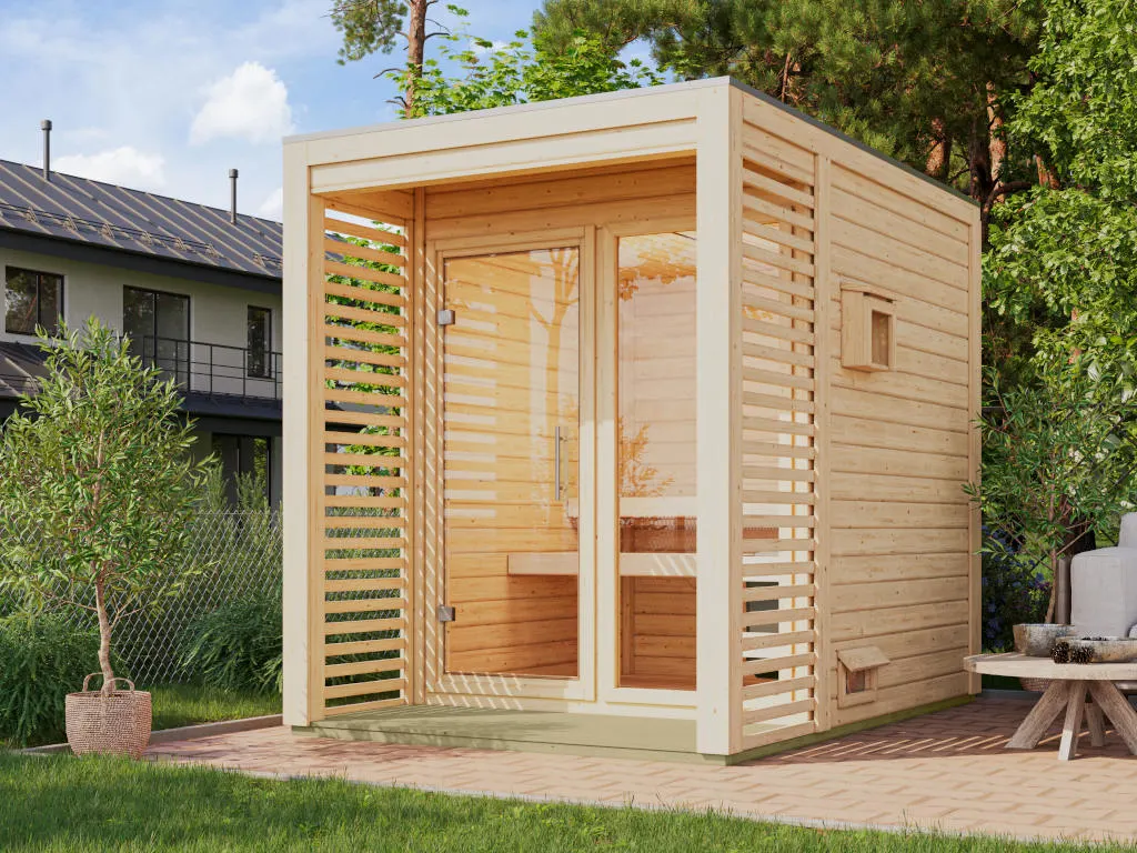 Erlebe pure Entspannung mit deiner Gartensauna: Hochwertige Materialien und attraktives Design sorgen für ein einzigartiges Saunaerlebnis direkt in deinem Garten. Hier können 2-3 Personen gleichzeitig saunieren.
