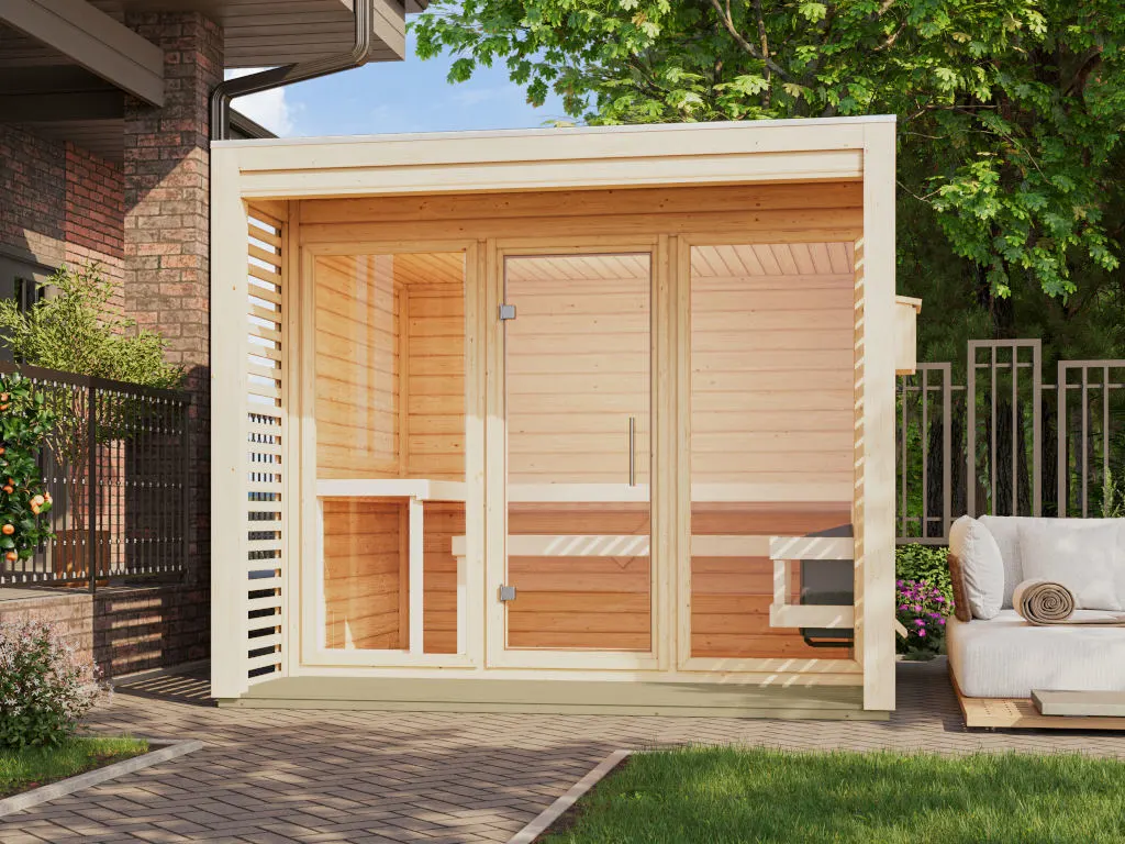 Das Saunahaus aus 38 mm starken Wandbrettern aus Fichte wird im Steck-/Schraubsystem montiert. Mit einem Gesamtmaß von 276 x 276 cm bietet es genügend Platz für ungestörte Wellnessstunden im eigenen Garten. Der Saunaraum ist mit einer Fläche von 264 x 184 cm natürlich ebenfalls ausreichend dimensioniert.