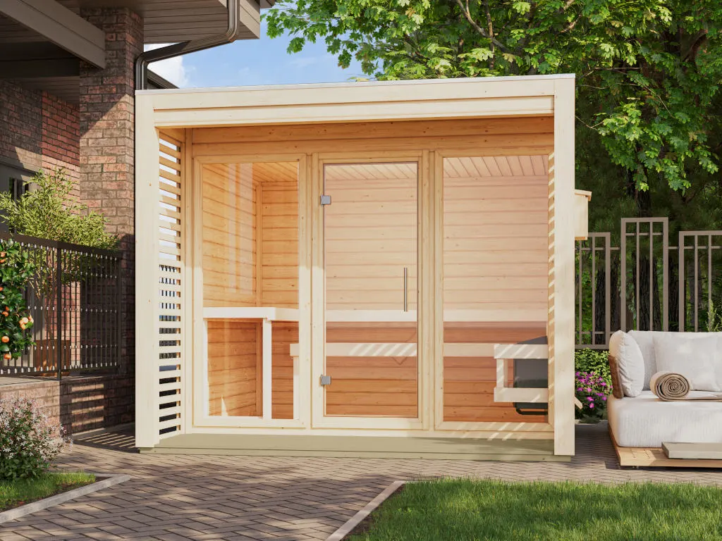 Erlebe pure Entspannung mit deiner Gartensauna: Hochwertige Materialien und attraktives Design sorgen für ein einzigartiges Saunaerlebnis direkt in deinem Garten. Mit einem Gesamtmaß von 276 x 276 cm bietet das Saunahaus genügend Platz für ungestörte Wellnessstunden im eigenen Garten. Hier können 3-4 Personen gleichzeitig saunieren.