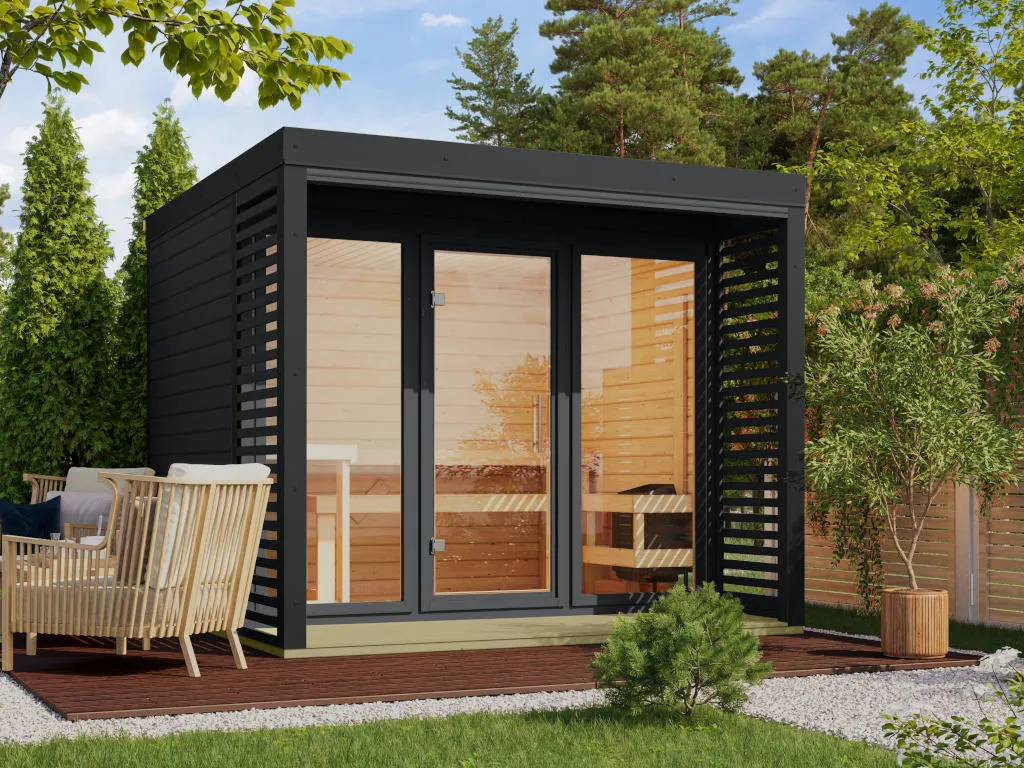 Erlebe pure Entspannung mit deiner Gartensauna: Hochwertige Materialien und attraktives Design sorgen für ein einzigartiges Saunaerlebnis direkt in deinem Garten. Hier können 3-4 Personen gleichzeitig saunieren.