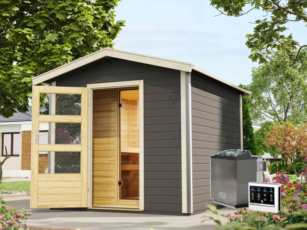 Das Saunahaus aus besten 38 mm starken Wandbrettern aus nordischer Fichte wird im Steck-/Schraubsystem montiert. Mit einem Gesamtmaß von 231 x 273 cm bietet es genügend Platz für ungestörte Wellnessstunden im eigenen Garten. Der Saunaraum ist mit einer Fläche von 219 x 184 cm natürlich ebenfalls ausreichend dimensioniert. Innen bieten 3 Saunabänke Platz zur Entspannung. Das formschöne und praktische Dach sorgt für den Witterungsschutz von oben. Für den nötigen Abstand zum Erdreich sorgen kesseldruckimprägnierte Bodenbalken. Auf diese werden die Wandbretter und die Nut- und Federbretter des Fußbodens montiert. Ein Ofenschutzgitter und alle notwendigen Schrauben und Beschläge sowie eine aussagekräftige Montageanleitung sind selbstverständlich ebenfalls dabei.