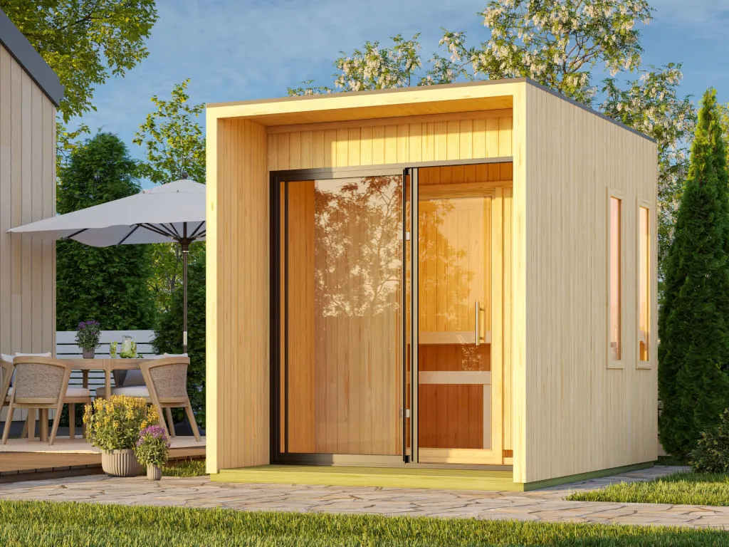 Erlebe pure Entspannung mit deiner Gartensauna: Hochwertige Materialien und attraktives Design sorgen für ein einzigartiges Saunaerlebnis direkt in deinem Garten. Hier können 2-3 Personen gleichzeitig saunieren.