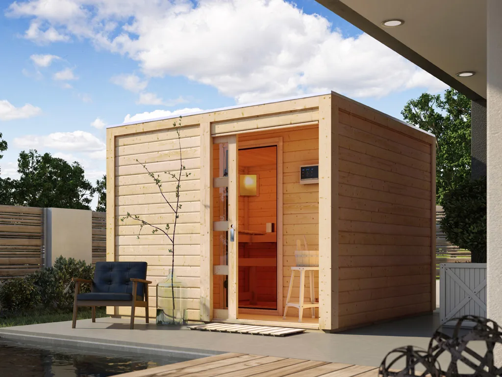 Die Wellness-Oase für Ihren Garten - Das Saunahaus mit praktischem Vorraum und bequemer Schiebetür