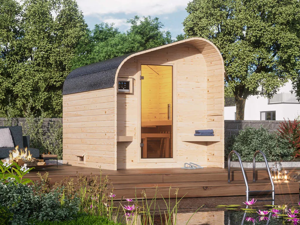 Dieses Saunamodell – eine System- bzw. Elementsauna – zeichnet sich durch seine besondere Sandwich-Bauweise aus, d. h., die Wandelemente bestehen aus einzelnen Schichten. Die bereits vorgefertigten Wandelemente aus Fichte ermöglichen einen schnellen Aufbau innerhalb weniger Stunden. Mit einer Wandstärke von 38 mm sind Systemsaunen optimal isoliert und somit besonders energiesparend. Wegen der sehr gut gedämmten Elemente heizt sich die Systemsauna extra schnell auf.