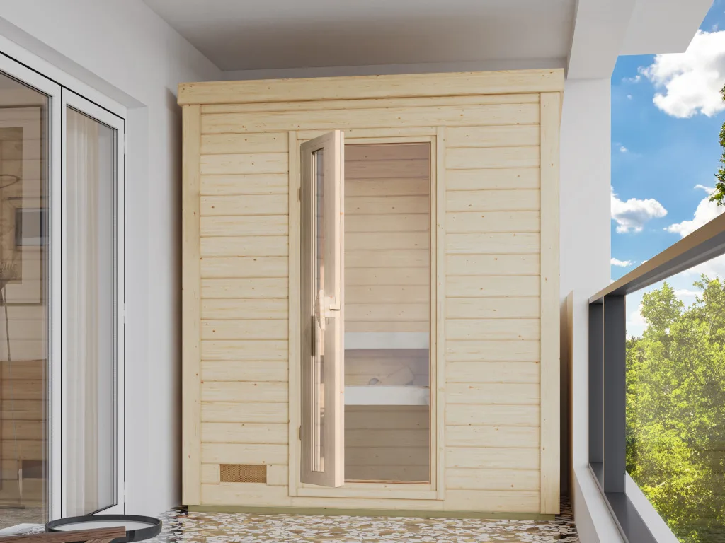 Dieses Saunamodell – eine System- bzw. Elementsauna – zeichnet sich durch seine besondere Sandwich-Bauweise aus, d. h., die Wandelemente bestehen aus einzelnen Schichten. Die bereits vorgefertigten Wandelemente aus Fichte ermöglichen einen schnellen Aufbau innerhalb weniger Stunden. Mit einer Wandstärke von 38 mm sind Systemsaunen optimal isoliert und somit besonders energiesparend. Wegen der sehr gut gedämmten Elemente heizt sich die Systemsauna extra schnell auf.