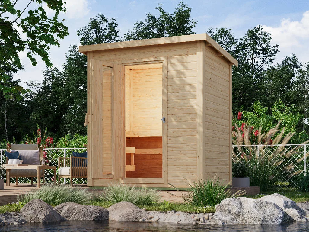 Dieses Saunamodell – eine System- bzw. Elementsauna – zeichnet sich durch seine besondere Sandwich-Bauweise aus, d. h., die Wandelemente bestehen aus einzelnen Schichten. Die bereits vorgefertigten Wandelemente aus Fichte ermöglichen einen schnellen Aufbau innerhalb weniger Stunden. Mit einer Wandstärke von 38 mm sind Systemsaunen optimal isoliert und somit besonders energiesparend. Wegen der sehr gut gedämmten Elemente heizt sich die Systemsauna extra schnell auf.