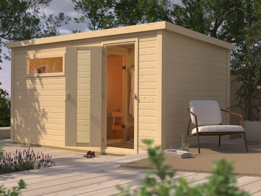 Das Saunahaus aus 38 mm starken Wandbrettern aus Fichte wird im Steck-/Schraubsystem montiert. Mit einem Gesamtmaß von 417 x 244 cm bietet es genügend Platz für ungestörte Wellnessstunden im eigenen Garten. Der Saunaraum ist mit einer Fläche von 219 x 184,5 cm natürlich ebenfalls ausreichend dimensioniert.