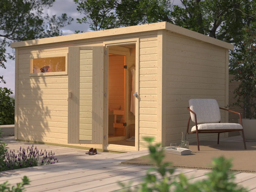 Erlebe pure Entspannung mit deiner Gartensauna: Hochwertige Materialien und attraktives Design sorgen für ein einzigartiges Saunaerlebnis direkt in deinem Garten. Hier können 3-4 Personen gleichzeitig saunieren.