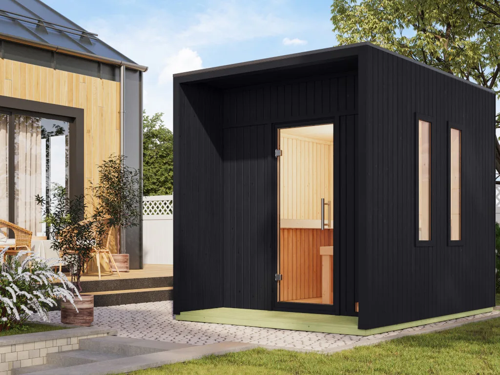 Erlebe pure Entspannung mit deiner Gartensauna: Hochwertige Materialien und attraktives Design sorgen für ein einzigartiges Saunaerlebnis direkt in deinem Garten. Hier können 3-4 Personen gleichzeitig saunieren.