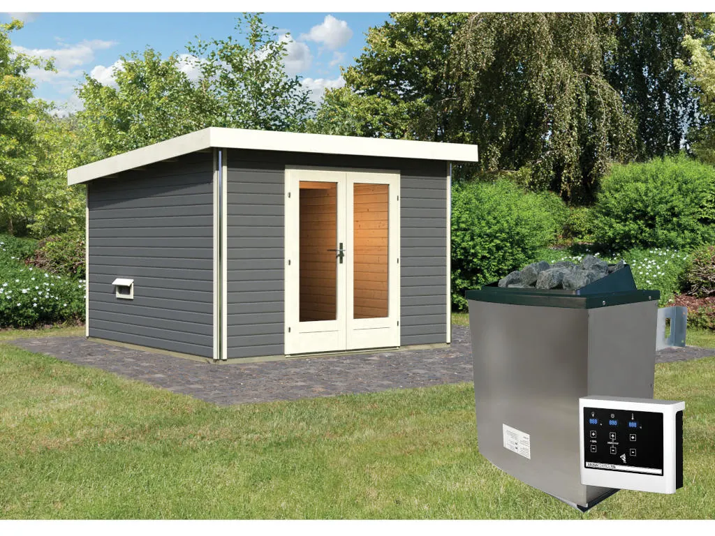 KARIBU Saunahaus Mainburg 1 terragrau 38 mm inkl. klassischer Saunaofen 9 kW + ext. Steuerung