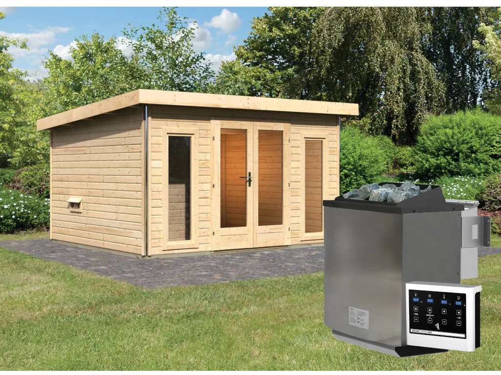 KARIBU Saunahaus Mainburg 2 naturbelassen 38 mm inkl. Bio-Kombiofen 9 kW + ext. Steuerung
