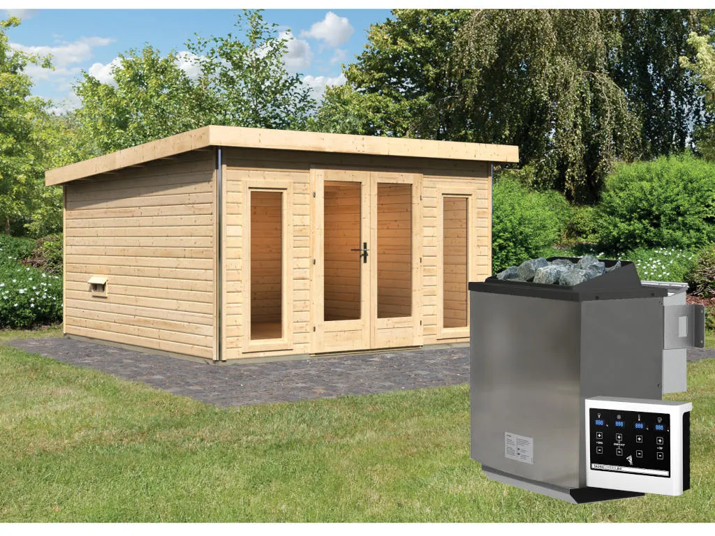 KARIBU Saunahaus Mainburg 3 naturbelassen 38 mm inkl. Bio-Kombiofen 9 kW + ext. Steuerung