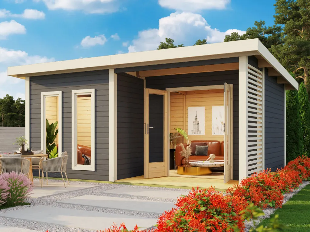 | Umbauter Raum (m³) Der umbaute Raum definiert das Außenvolumen eines Gartenhauses, Carports & Co. inkl. aller Anbauten, Dachüberstände, etc. Im Gegensatz zum Immobilien-Baurecht ist der umbaute Raum bei Gartenhäusern nicht gleichzusetzen mit dem Bruttorauminhalt. | 42 m³ |
