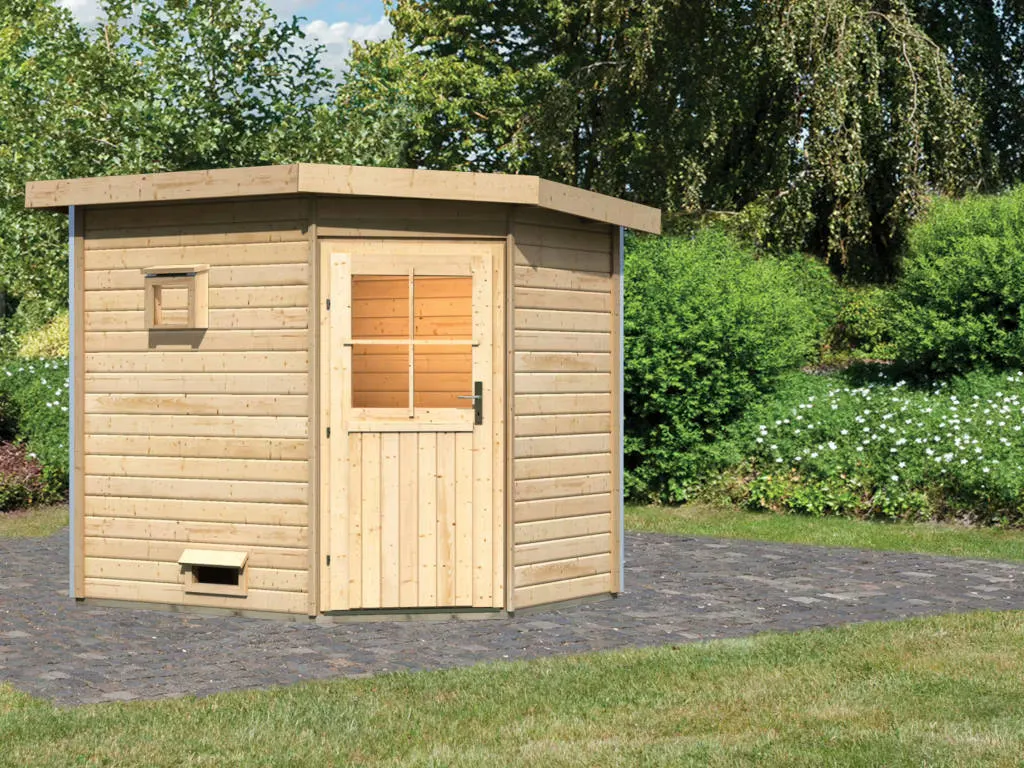 KARIBU Saunahaus Mikka mit klassischer Tür naturbelassen