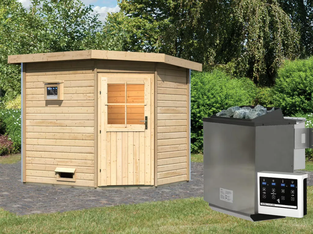 Diese Innensauna wird mit Saunaofen und einer externen Steuerung geliefert. Die Anbringung des Steuergerätes erfolgt an der Außenseite der Sauna. Ganz komfortabel kann somit die Saunasteuerung von außen erledigt und die Temperatur exakt bestimmt werden. Zusätzlich verfügt das Steuergerät über eine Anschlussstelle, über die ein weiteres elektrisches Gerät bedient werden kann.