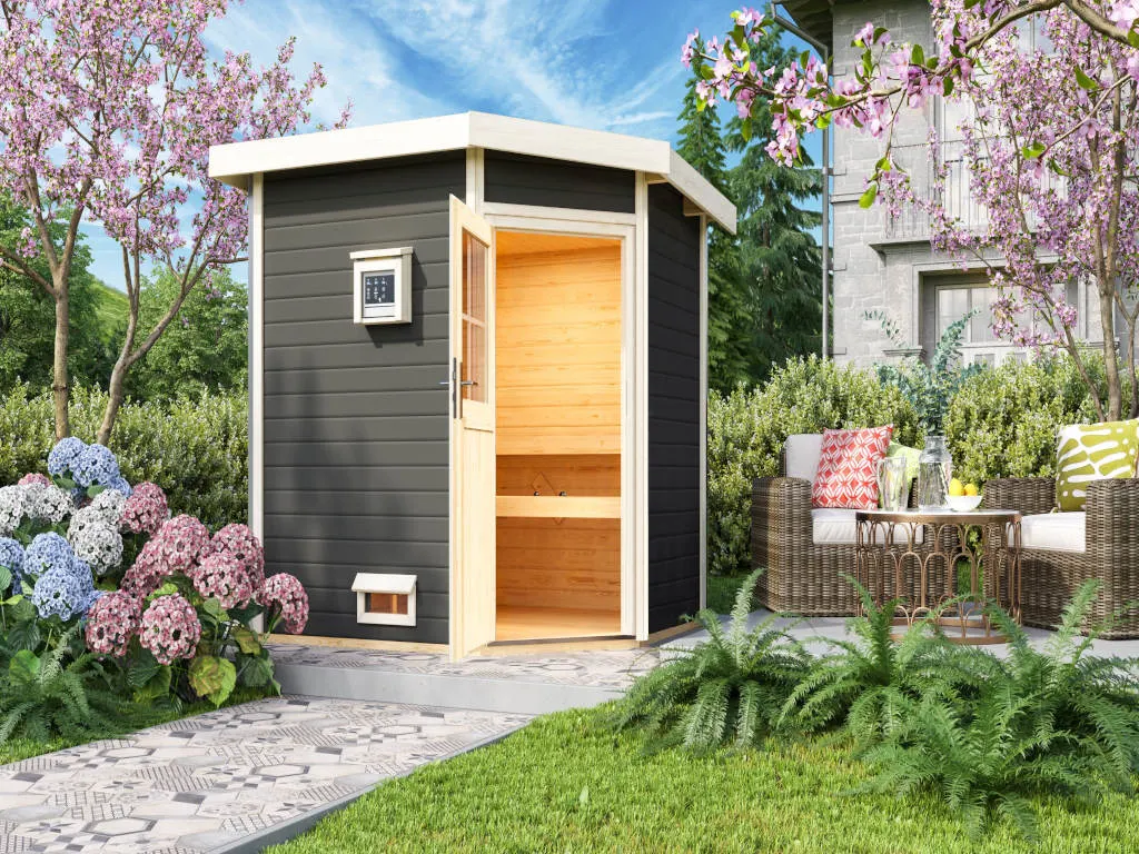 KARIBU Saunahaus Mikka mit klassischer Tür Terragrau