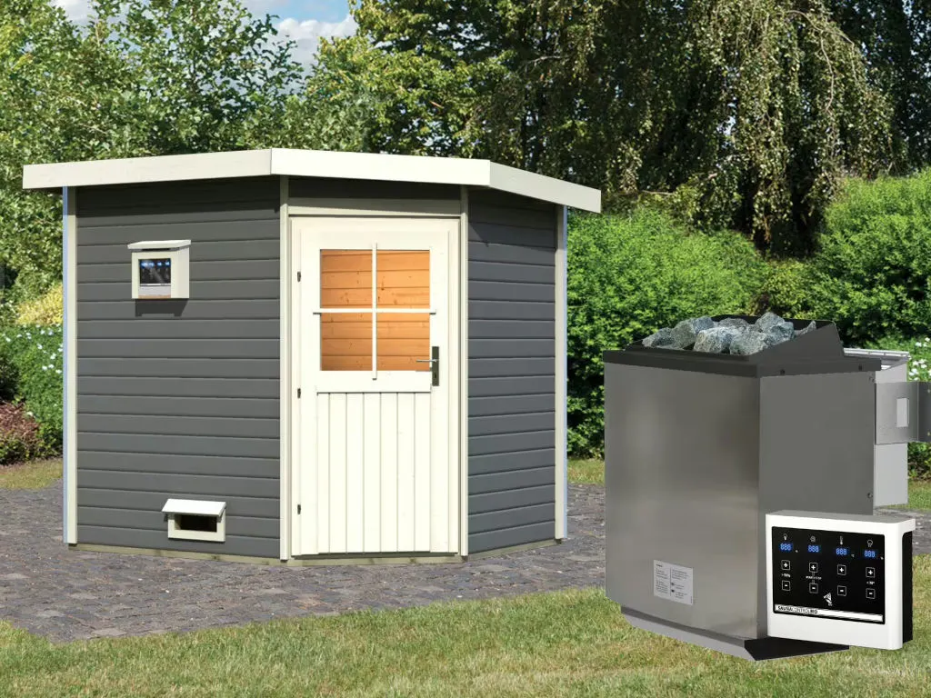 Bei dieser Innensauna ist ein Saunaofen mit einer externen Steuerung inklusive. Das Steuergerät wird außerhalb der Sauna angebracht. Auf diese Weise fängt schon vor dem Saunieren der Komfort an – mit einer bequemen Bedienung von außen und einer noch exakteren Temperatureinstellung. Weitere elektrische Geräte wie die Kabinenbeleuchtung können ebenso an die externe Steuerung angeschlossen und bedient werden.