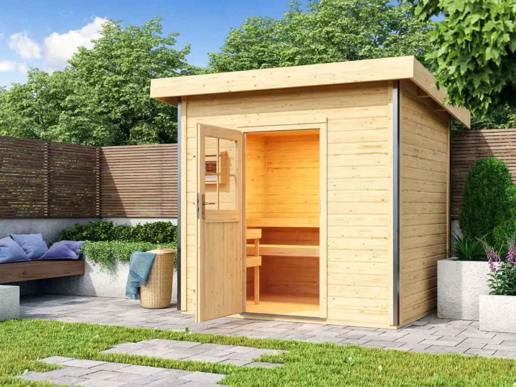 Erlebe pure Entspannung mit deiner Gartensauna: Hochwertige Materialien und attraktives Design sorgen für ein einzigartiges Saunaerlebnis direkt in deinem Garten. Hier können 3-4 Personen gleichzeitig saunieren.