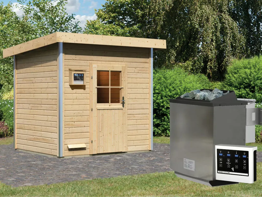 Diese Innensauna wird einschließlich Saunaofen mit externer Steuerung geliefert. Die Anbringung an der Außenseite der Sauna ermöglicht eine praktische Bedienung vor dem Saunieren und eine noch exaktere Einstellung der Temperatur. Weitere elektrische Geräte wie eine Kabinenbeleuchtung können ebenso an die externe Steuerung angeschlossen und mit dieser bedient werden.