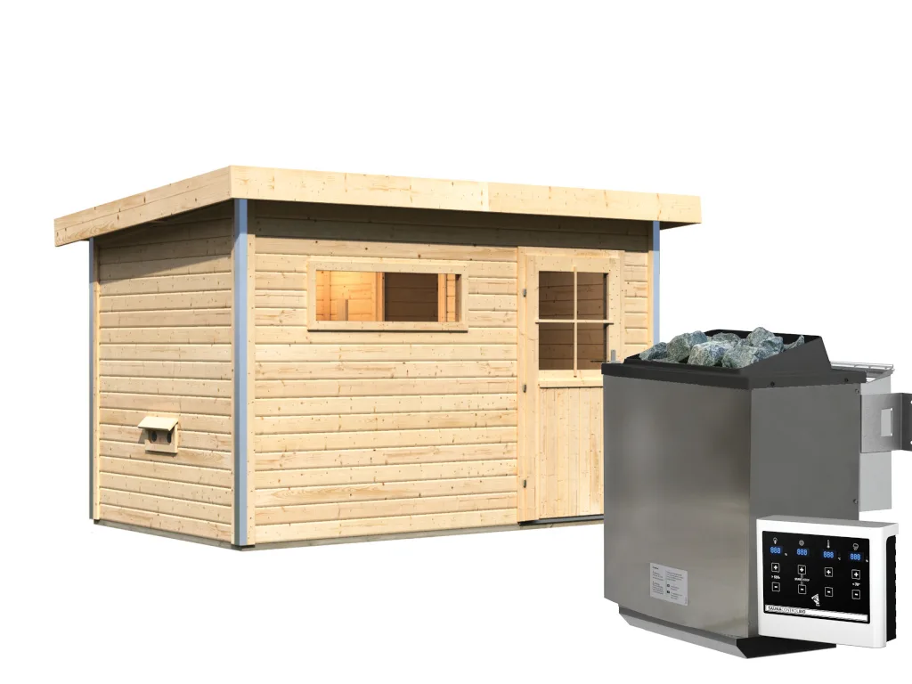 KARIBU Saunahaus Skrollan 1 mit klassischer Tür SET naturbelassen