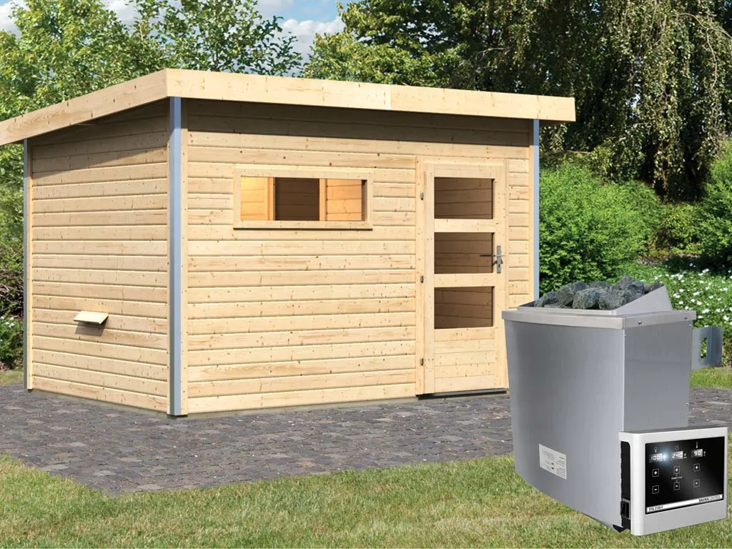 KARIBU Saunahaus "Skrollan 2" 38 mm inkl. 9 kW Saunaofen mit externer Steuerung Easy