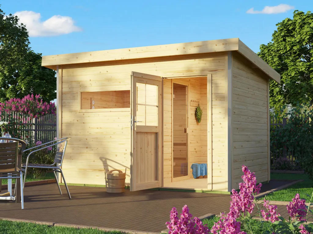 Erlebe pure Entspannung mit deiner Gartensauna: Hochwertige Materialien und attraktives Design sorgen für ein einzigartiges Saunaerlebnis direkt in deinem Garten. Hier können 2-3 Personen gleichzeitig saunieren.