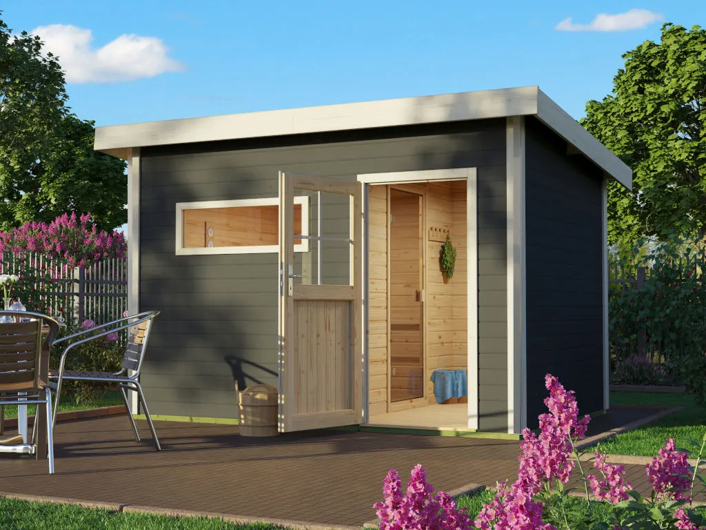Erlebe pure Entspannung mit deiner Gartensauna: Hochwertige Materialien und attraktives Design sorgen für ein einzigartiges Saunaerlebnis direkt in deinem Garten. Hier können 2-3 Personen gleichzeitig saunieren.