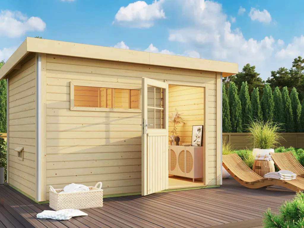 Erlebe pure Entspannung mit deiner Gartensauna: Hochwertige Materialien und attraktives Design sorgen für ein einzigartiges Saunaerlebnis direkt in deinem Garten. Hier können 3-4 Personen gleichzeitig saunieren.