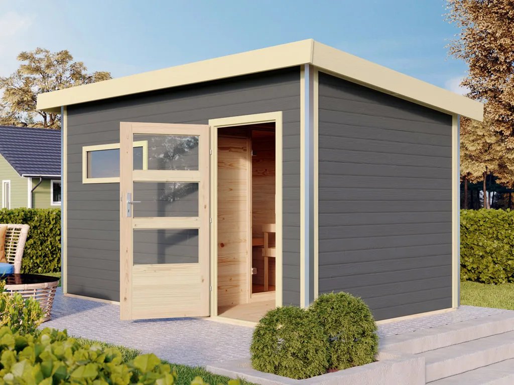 KARIBU Saunahaus "Skrollan 3" mit moderner Tür terragrau