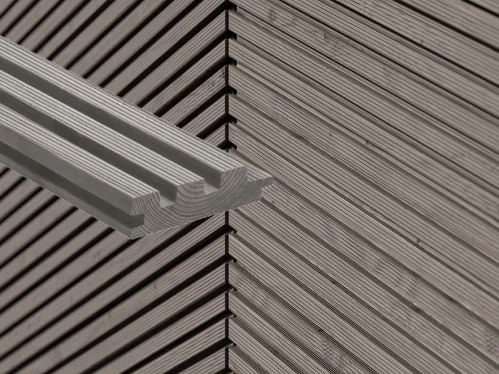 Die Thermokiefer eignet sich aufgrund ihrer enormen Haltbarkeit hervorragend für die Anwendung im Außenbereich und durch die Rhombusleiste wird eine gute Wasserableitung an deiner Fassade gewährleistet.