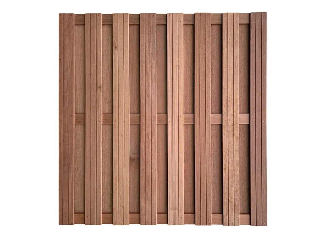 Das rötlich-braune Holz hat eine schlichte Struktur und ergibt ein ruhiges und natürliches Gesamtbild im Außenbereich.
