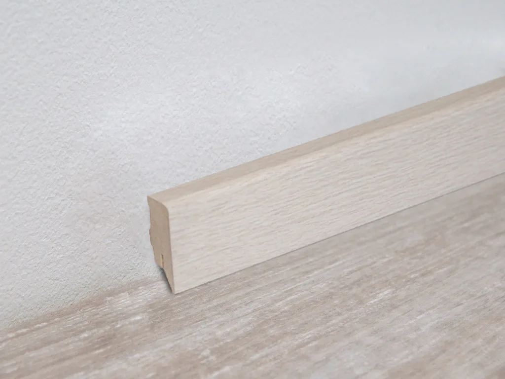 Folierte Sockelleiste mit stabilem MDF-Kern und ansprechendem Dekor.
