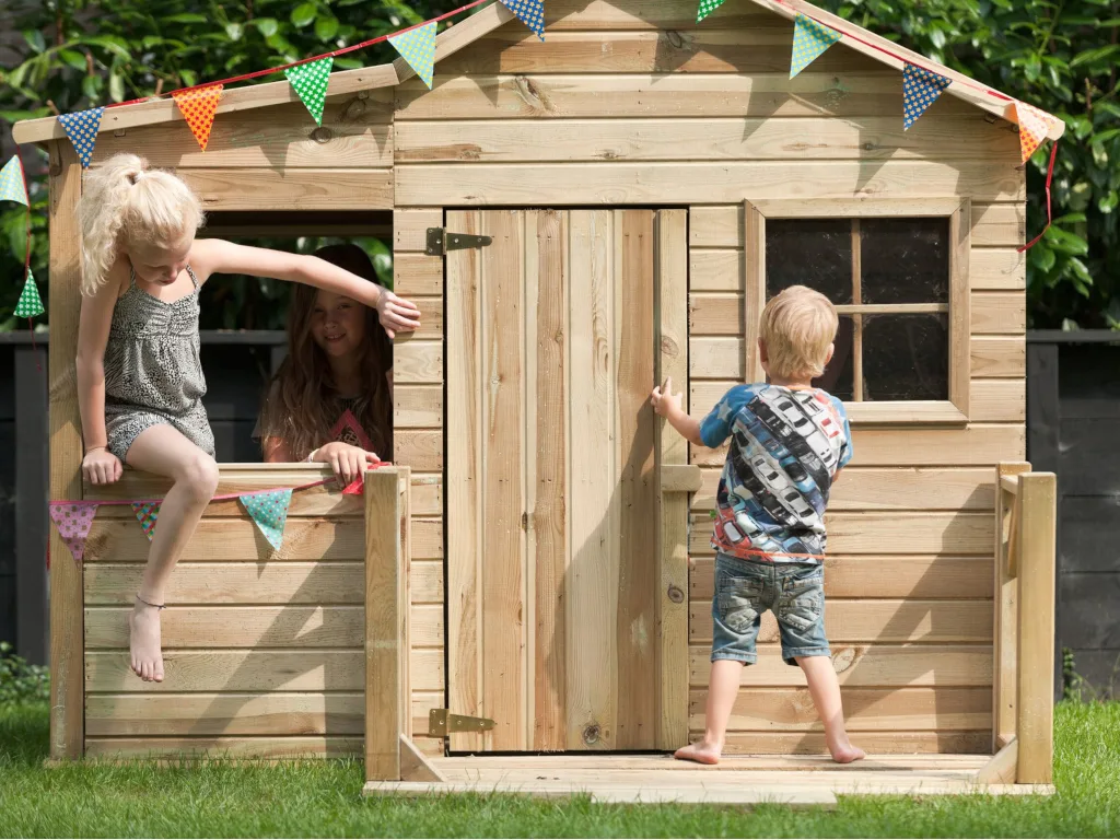 Das Spielhaus ist aus Holz gefertigt. Der Naturstoff ist das perfekte Material für Kinderspielgeräte – strapazierfähig und beständig. Für die Herstellung wurde erstklassiges Kiefernholz verwendet, welches durch seine Widerstandsfähigkeit und Robustheit punktet. Das Holz ist kesseldruckimprägniert, d. h., es werden Imprägniermittel unter hohem Druck ins Holz gepresst. Auf diese Weise dringen sie tief ins Holz ein und schützen es optimal vor UV-Strahlung, Witterung und Schädlingsbefall.