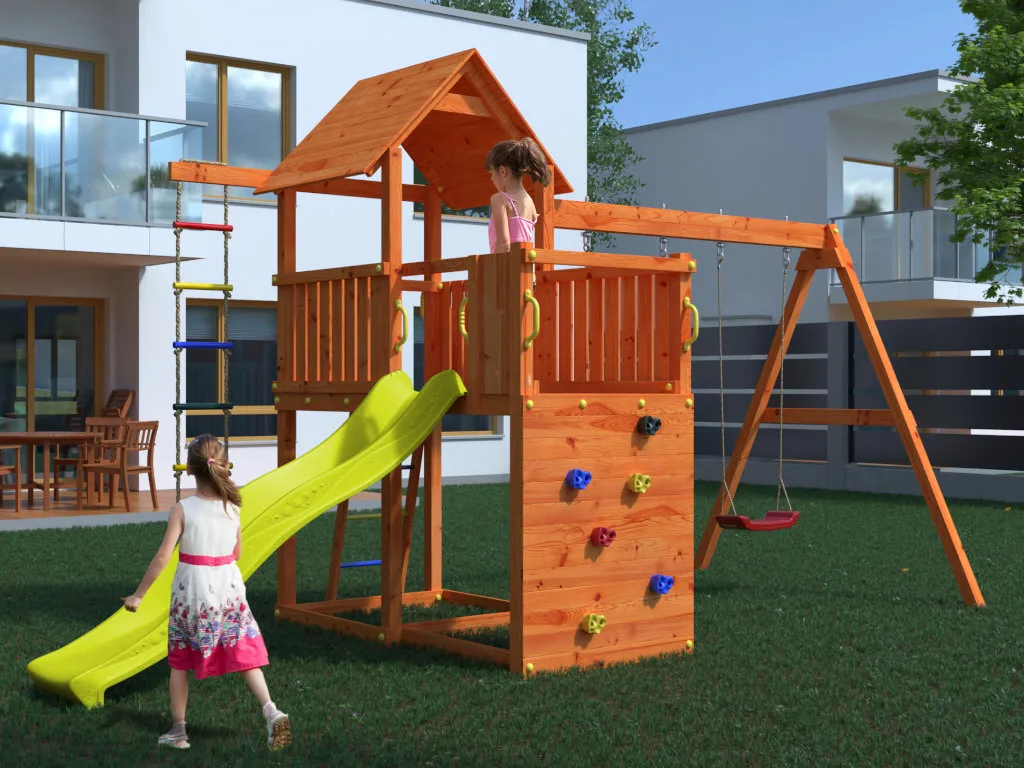 Noch mehr Abwechselung bringen der Podestanbau und Anbau mit zwei Schaukeln, die mehr Platz zum Spielen schaffen und problemlos auch von mehreren Kindern gleichzeitig benutzt werden kann. Die 2,28 m lange Rutsche sorgt für den schnellen Abgang und kann im Sommer in eine Wasserrutsche verwandelt werden. Beide Leitermodule sind mit den abgerundeten Metallsprossen aus Kunststoff ausgestattet. Sie sorgen für splitterfreie und glatte Greifflächen. Die Abdeckkappen für Schrauben und 8 Haltegriffe garantieren die zusätzliche Sicherheit beim Spielen.