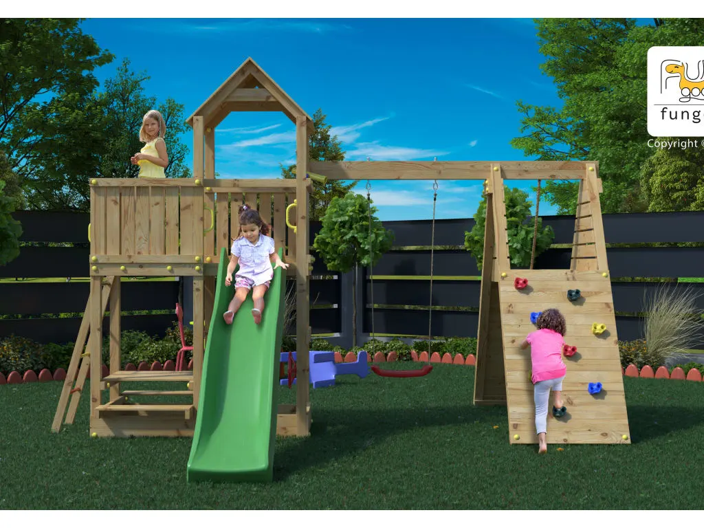 | Lieferumfang | Fluppi KDI, Einzelschaukel, 1x Schaukelsitz rot, Podestanbau, Kletteranbau m. Kletterwand+Rampe, Knotenseil, Klettersteine, Picknicktisch, Sandkasten, Leiter mit Metallsprossen, Abdeckkappen, 4x Griffe, 6x Bodenanker, 1x Lenkrad, 1x Teleskop, 1x Rutsche |