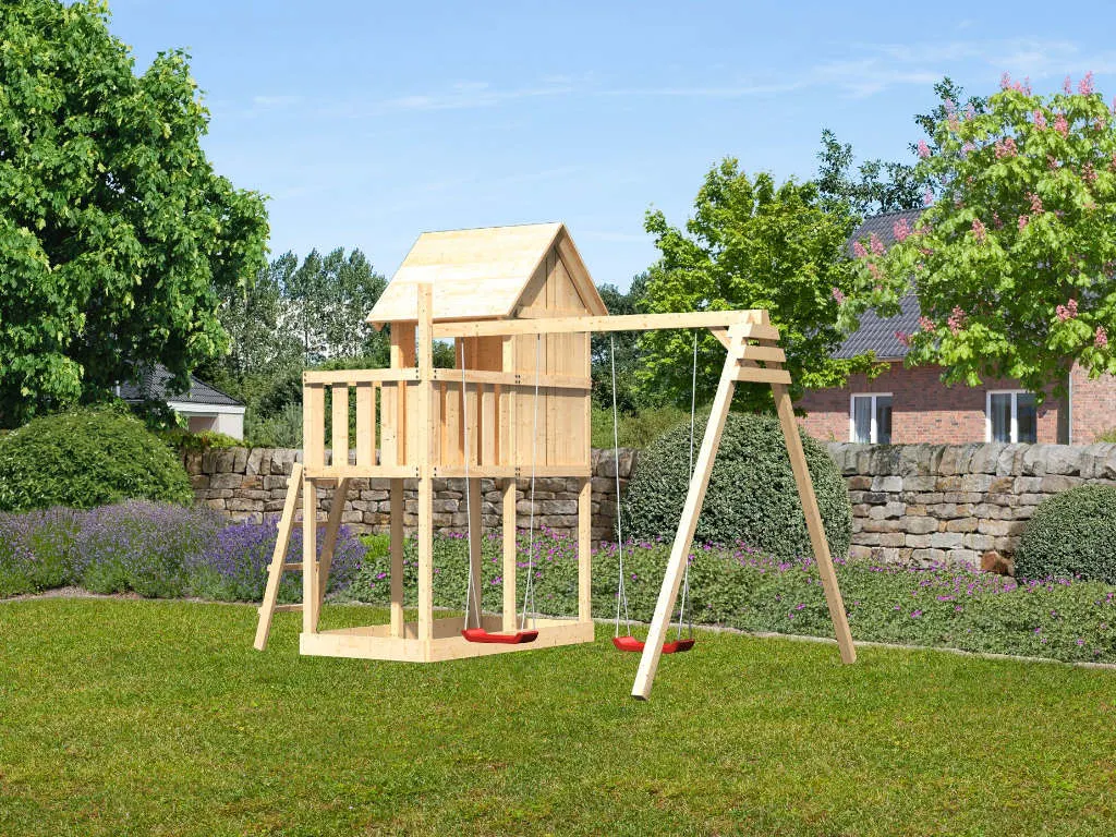 Der Spielturm hat 68 x 68 mm starke Massivholzpfosten, welche Auflage für das Satteldach bieten. Die Grundfläche (Basis-Turm) von 107 x 107 cm und die Firsthöhe von 291 cm sind der Ausdruck von Qualität. Nordische Fichte aus dem hohen Norden Europas ist der Grundstoff für diese Qualität. Das dort aufgrund von härteren klimatischen Bedingungen langsam wachsende Holz bildet engstehende Jahresringe und sorgt dafür, dass das Fichtenholz härter als mitteleuropäisches Nadelholz ist. Die 4 Pfosten des Grundturmes werden mittels Schaukelankern im Untergrund befestigt.