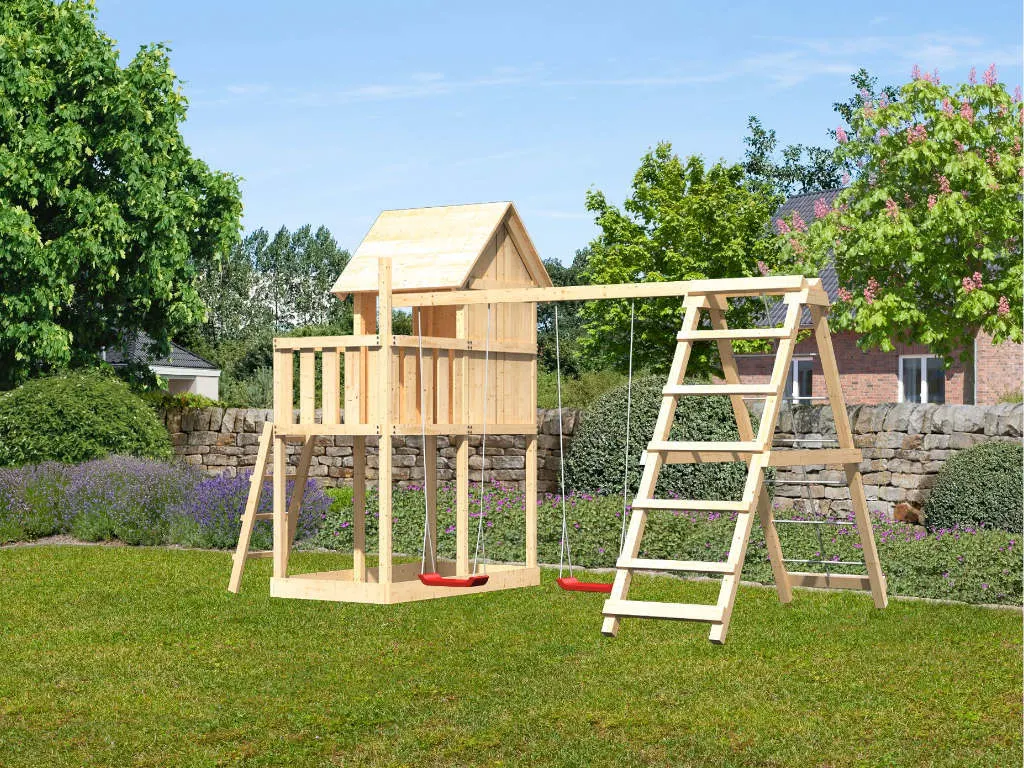 Spielturm Frieda naturbelassen inkl. Doppelschaukel + Klettergerüst + Netzrampe