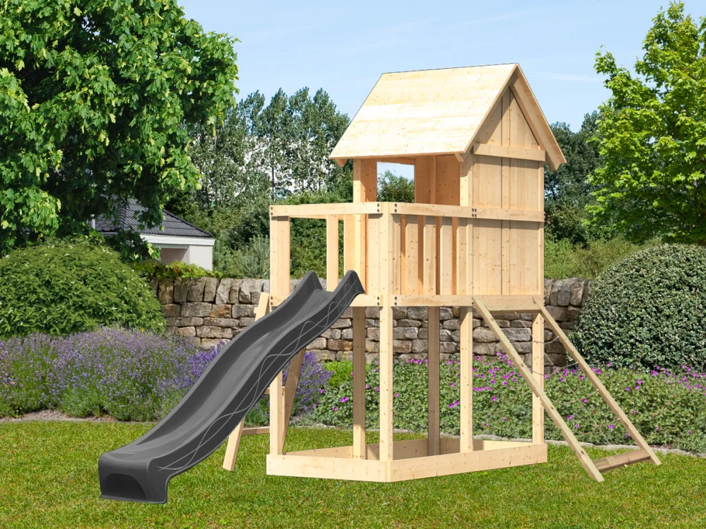 Spielturm Frieda naturbelassen inkl. Rutsche anthrazit + Netzrampe