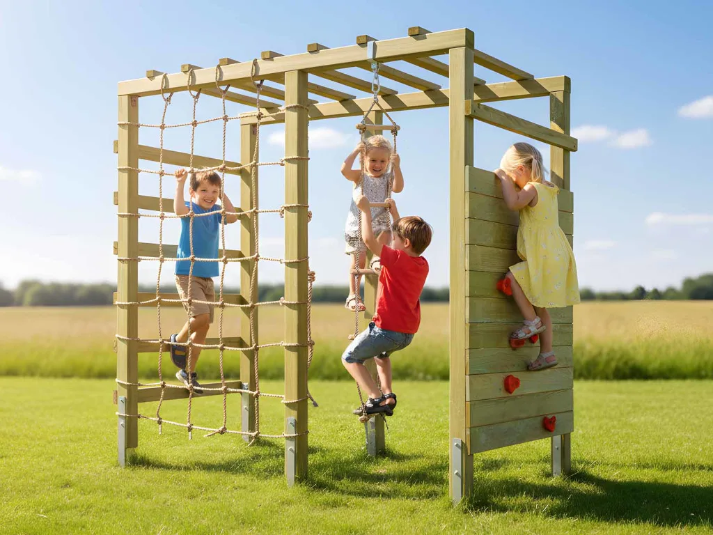 Material: Holz, B x T x H: 240 x 120 x 219 cm, inkl. Kletterwand + Kletternetz, inkl. Kontenseil + Strickleiter + Reckstange