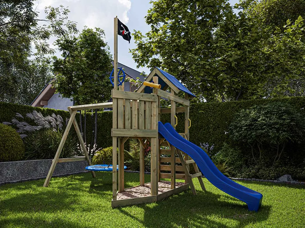Für kleine Entdecker und große Piraten bietet dir der Spielturm eine Captain-Jolly-Flagge. Dieser Name ist das berühmte Symbol für alle Piraten. Aus der Ferne erkennbar und der Traum eines jeden Piraten unter einem zu segeln. Das große Schiff mit seinen 507 x 255 x 258 cm bietet ein Dach, um vor der rauen See zu schützen und unbekannte Inseln auch bei Stürmen zu finden. Die Aussichtsplattform wurde dafür auf 122 cm Höhe angesetzt. Um sich schnell ins Abenteuer zu stürzen, findet sich eine blaue Rutsche an Backbord (links). Doch um wieder schnell in See zu stechen, ist eine Kletterwand am Heck des Schiffes oder eine Leiter an der Steuerbordseite. Sollten andere Piraten auf hoher See auftauchen, ist das Schiff mit einer Nestschaukel ausgerüstet, um schnell auf das andere Schiff zu gelangen.
