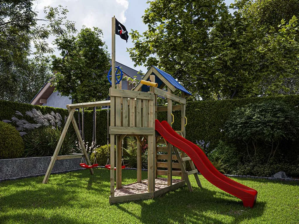 Für kleine Entdecker und große Piraten bietet dir der Spielturm eine Captain-Jolly-Flagge. Dieser Name ist das berühmte Symbol für alle Piraten. Aus der Ferne erkennbar und der Traum eines jeden Piraten, unter einem zu segeln. Das große Schiff mit seinen 507 x 255 x 258 cm bietet ein Dach, um vor der rauen See zu schützen und unbekannte Inseln auch bei Stürmen zu finden. Die Aussichtsplattform wurde dafür auf 122 cm Höhe angesetzt. Um sich schnell ins Abenteuer zu stürzen, findet sich eine blaue Rutsche an Backbord (links). Doch um wieder schnell in See zu stechen, ist eine Kletterwand am Heck des Schiffes oder eine Leiter an der Steuerbordseite. Sollten andere Piraten auf hoher See auftauchen, ist das Schiff mit einer Doppelschaukel ausgerüstet, um schnell auf das andere Schiff zu gelangen.