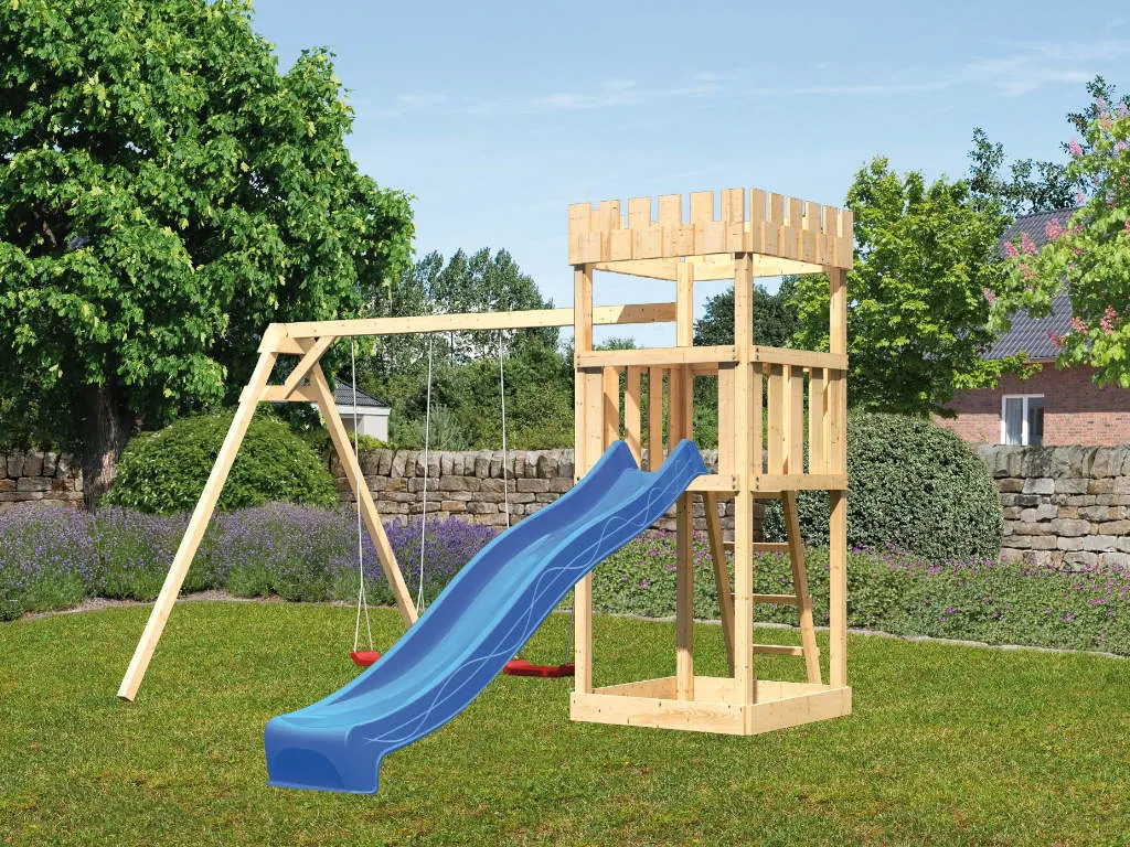 • Spielturm Löwenherz, inkl. Doppelschaukel, Rutsche blau