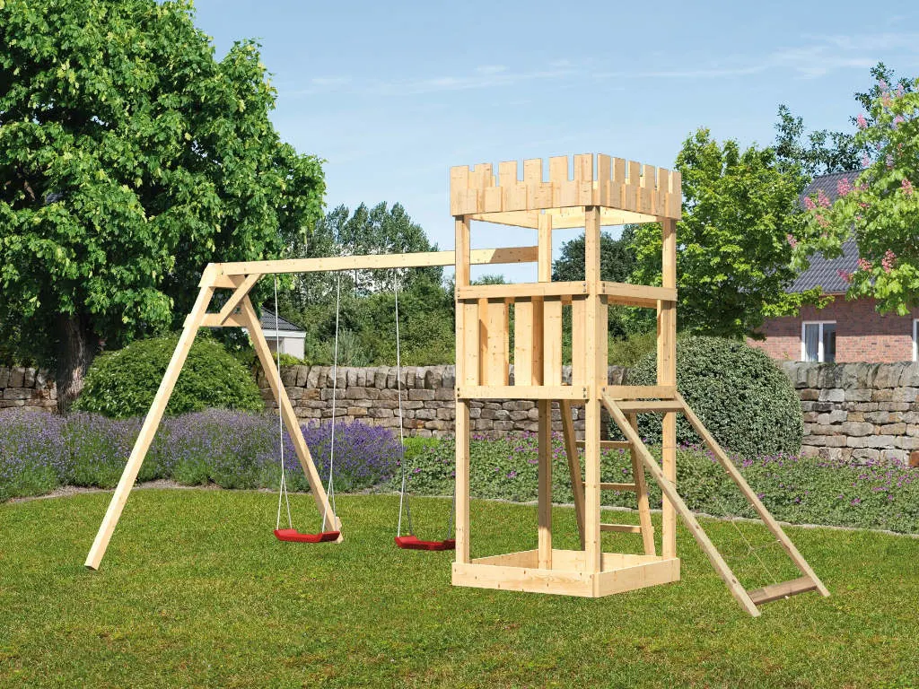 Bei diesem Spielturm steht viel Bewegung auf dem Programm. Ein eigenes Abenteuerland für dein Kind für jede Menge Spiel und Spaß! Die Firsthöhe liegt bei 295,5 cm.