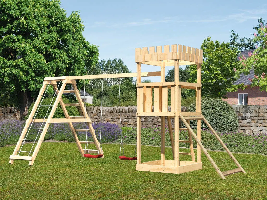 • Spielturm Löwenherz, inkl. Netzrampe, Doppelschaukel Klettergerüst