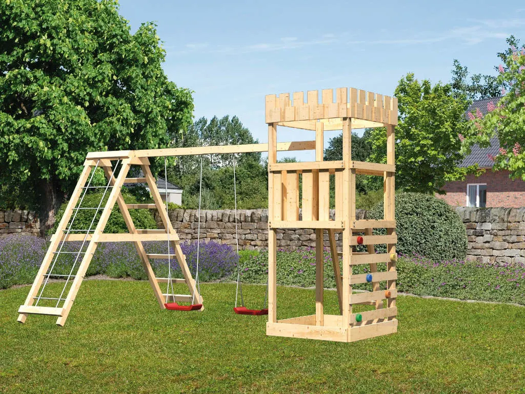 • Spielturm Löwenherz, inkl. Kletterwand, Doppelschaukel Klettergerüst