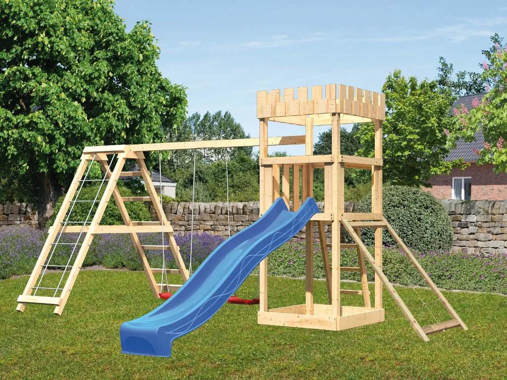 • Spielturm Löwenherz, inkl. Doppelschaukel Klettergerüst, Netzrampe, Rutsche blau