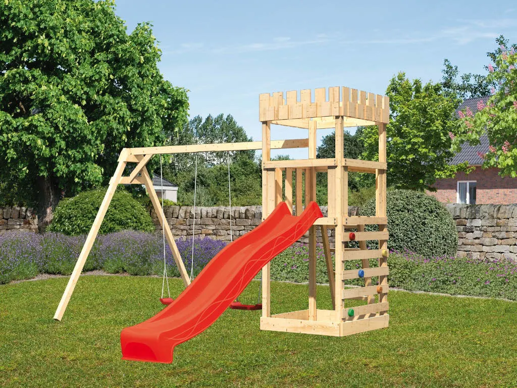 • Spielturm Löwenherz, inkl. Doppelschaukelanbau, Kletterwand, Rutsche rot
